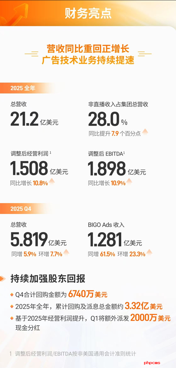 2025年全年,集团总收入21.2亿美元。其中,直播业务收入15.3亿美元;BIGO Ads收入3.985亿美元,同比大增38.5%,推动非直播整体收入占比提升至28%,较2024年提升7.9个百分点。