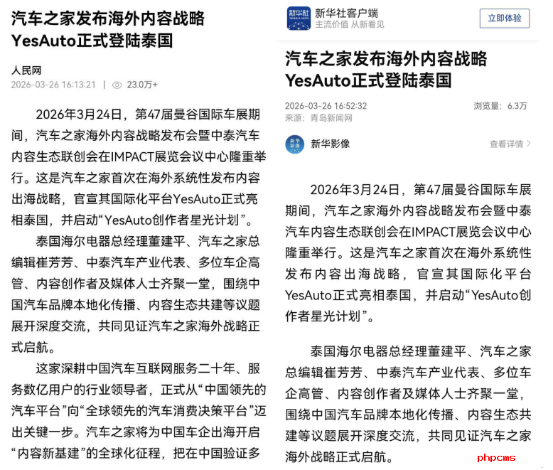 报道显示,3月24日,在第47届曼谷国际车展期间,汽车之家正式发布海外内容战略,其国际化平台YesAuto登陆泰国,并启动“创作者星光计划”。这是汽车之家首次在海外系统性布局内容生态,标志着这家国内头部汽车垂直平台正加速从“中国领先”向“全球领先”迈进。